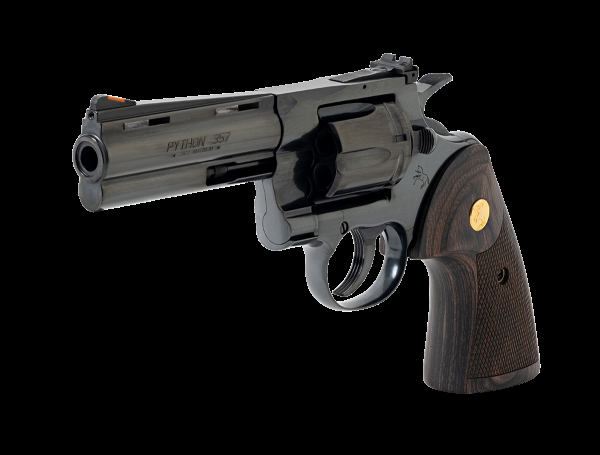 La Python es un revólver 357 Magnum de doble acción. Las longitudes iniciales de cañón ofrecidas en esta nueva Python pavonada son 4,25" y 6". Este revólver cuenta con un punto de mira trasero ajustable, así como un punto de mira delantero reemplazable por el usuario, utilizando un tornillo prisionero para su retención. Este revólver tiene la acción actualizada con su primo inoxidable. La acción refinada ha demostrado ser extremadamente robusta y no requiere ajuste manual, para un tiro consistente. Las cachas de nogal se han actualizado con un medallón dorado, como es históricamente el color correcto para una Python pavonada. La Python pavonada de probada eficacia ha evolucionado, adaptándose a las necesidades cambiantes e incorporando la fabricación moderna para mantener su fiabilidad y eficacia.